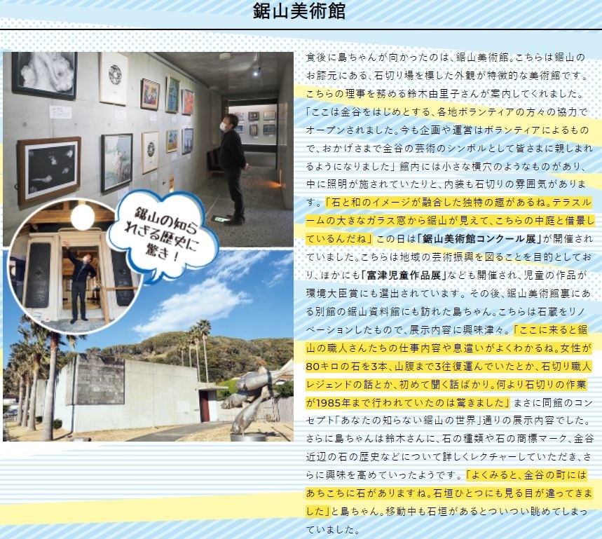 こちらは地域の芸術振興を図ることを目的としており、ほかにも「富津児童作品展」なども開催され、児童の作品が環境大臣賞にも選出されています。 その後、鋸山美術館裏にある別館の鋸山資料館にも訪れた島ちゃん。こちらは石蔵をリノベーションしたもので、展示内容に興味津々。