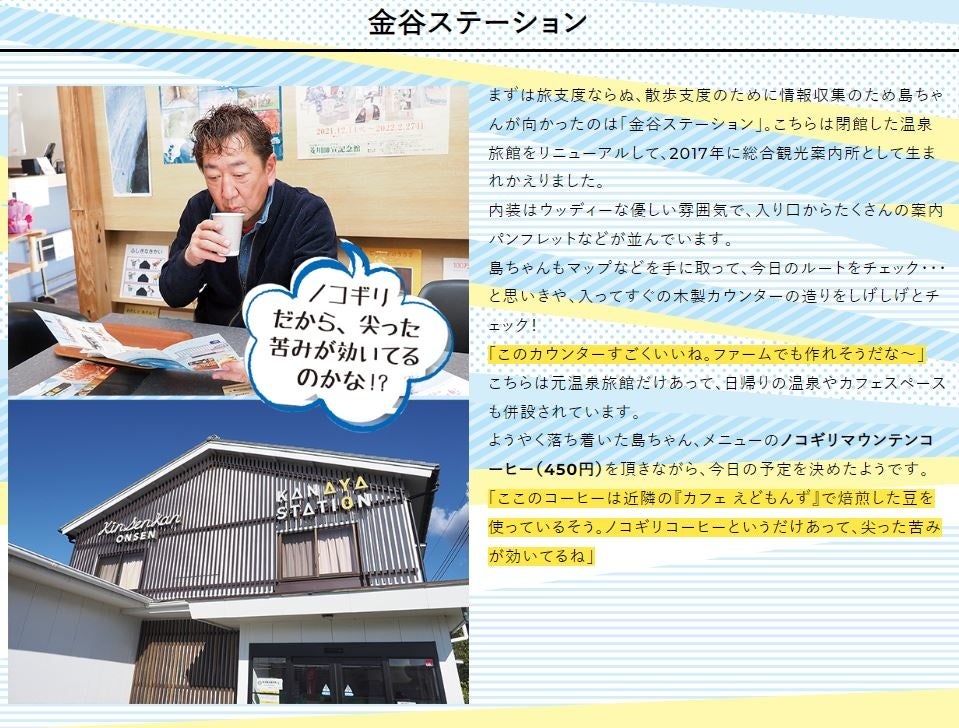 まずは旅支度ならぬ、散歩支度のために情報収集のため島ちゃんが向かったのは「金谷ステーション」。こちらは閉館した温泉旅館をリニューアルして、2017年に総合観光案内所として生まれかえりました。