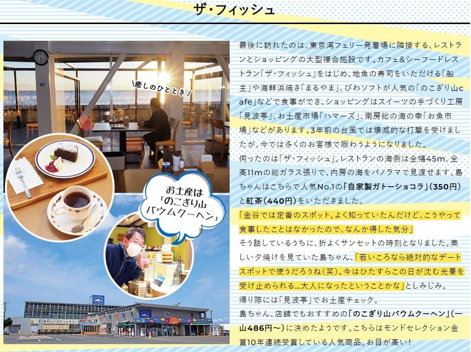 最後に訪れたのは、東京湾フェリー発着場に隣接する、レストランとショッピングの大型複合施設です。カフェ&シーフードレストラン「ザ・フィッシュ」をはじめ、地魚の寿司をいただける「船主」や海鮮浜焼き「まるやま」、びわソフトが人気の「のこぎり山cafe」などで食事ができ、ショッピングはスイーツの手づくり工房「見波亭」、お土産市場「ハマーズ」、南房総の海の幸「お魚市場」などがあります。3年前の台風では壊滅的な打撃を受けましたが、今では多くのお客様で賑わうようになりました。
