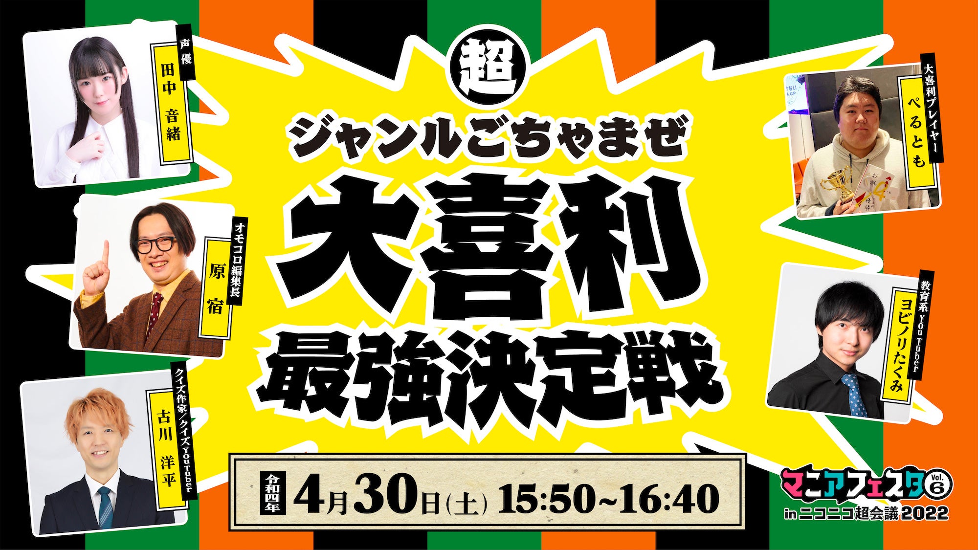 声優、webクリエイター、クイズ界隈などニコ超で人気のジャンルの人たちが大喜利で戦うお祭りです!「アフレコ大喜利」「実況大喜利」など、ジャンルごちゃまぜな最強大喜利対決がここに!
