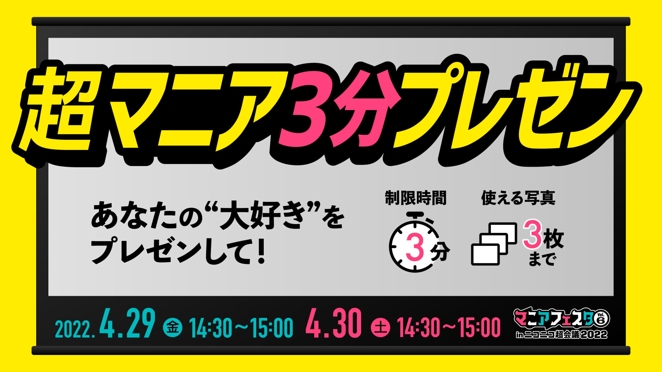 好きな食べ物や好きなお店、大好きなアイドル……出展者のマニアが制限時間3分間・写真3枚で、「大好きなもの」について自由にプレゼン!3分間で「好き」を伝えるマニアのための時間です。