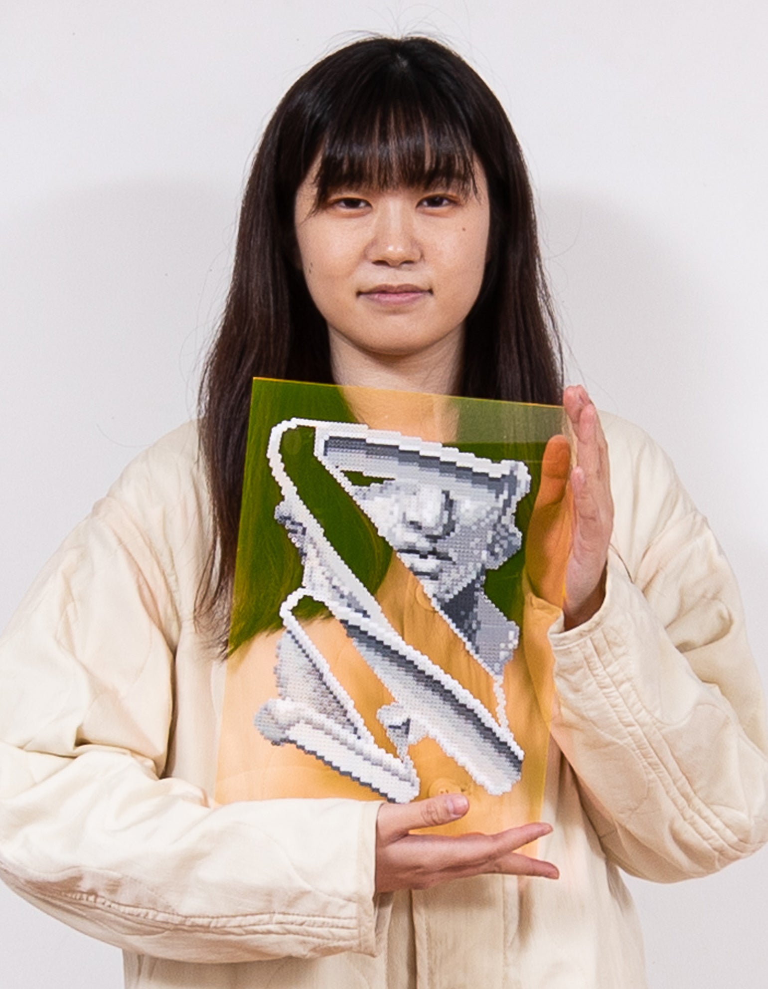 1992年生まれ、千葉県出身。2022年東京芸術大学大学院修了。 インターネットが日常的に使用されるデジタルネイティブ世代に生まれた彼女は、二次元と三次元の空間の往復の方法を探り、パソコン上で加工されたイメージをインスタレーションや、絵画、デジタルコラージュなどで表現している。素材の一部ではアイロンビーズという子供のおもちゃを使用しており一つ一つ並べる事でイメージを構築するようなアナログ的な表現方法を用いながらもコンピューターバグのようなデジタル上でしか起こり得ないズレを視覚的に発生させている。バーチャル空間の拡張により変わり始める現実世界に焦点を当てている現代アーティストである。