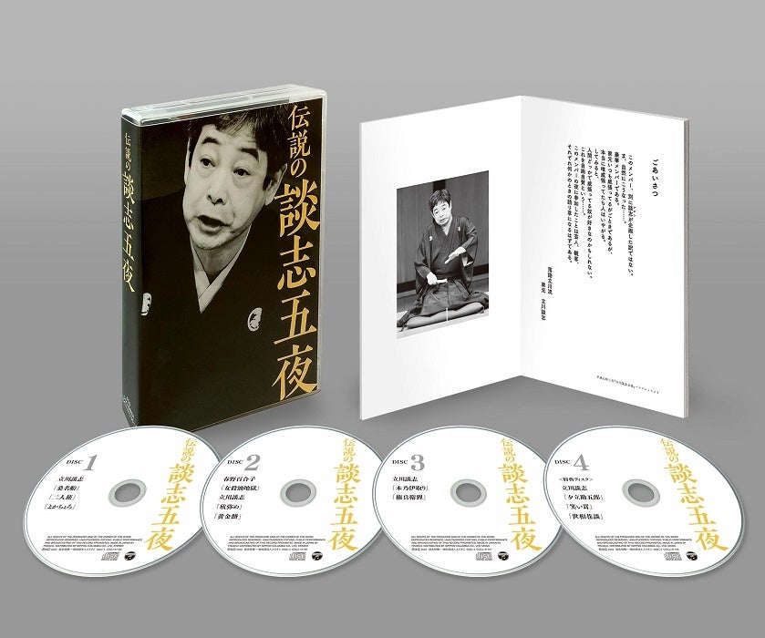 「談志五夜」とは50代後半の談志が、一門や交際のある実演家に幅広く声をかけてして実現した寄席バラエティであり、演芸界の注目を集める大イベントであった。その貴重な音源を高音質リマスターした五席の落語のほか、第四夜に参加し談志が激賞した春野百合子の浪花節や友人たちの飛び入りシーンも特別所収。