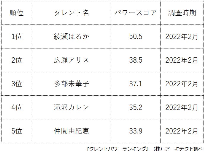 『タレントパワーランキング』では、タレントパワーランキングに登録されている2022年の春ドラマ出演タレントのパワースコアを調査。