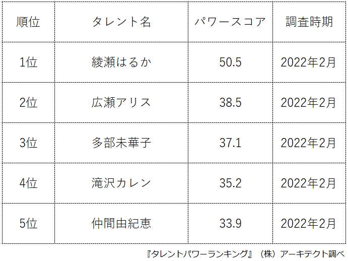 『タレントパワーランキング』では、タレントパワーランキングに登録されている2022年の春ドラマ出演タレントのパワースコアを調査。