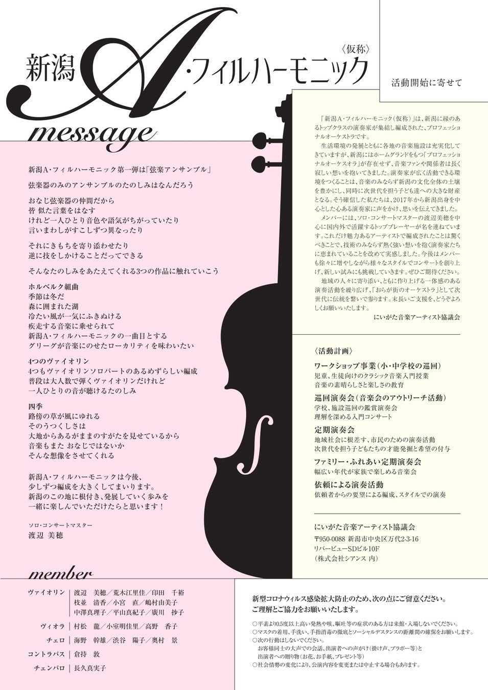 ソロ・コンサートマスターの渡辺美穂を中心に国内外で活躍する新潟ゆかりの魅力的なトッププレーヤーが終結。