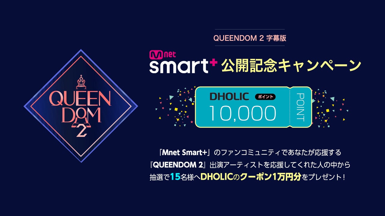 動画配信サービスMnet Smart+での「QUEENDOM 2」VOD配信を記念して、おしゃれなファッション洋服通販サイトDHOLICのクーポンが当たるキャンペーンがスタートします!「Mnet Smart+」に会員登録いただいている方が対象となります(有料プランにご加入ではない無料会員の方もご参加可能です。CS放送Mnetにご加入の方は対象外となります。予めご了承ください)