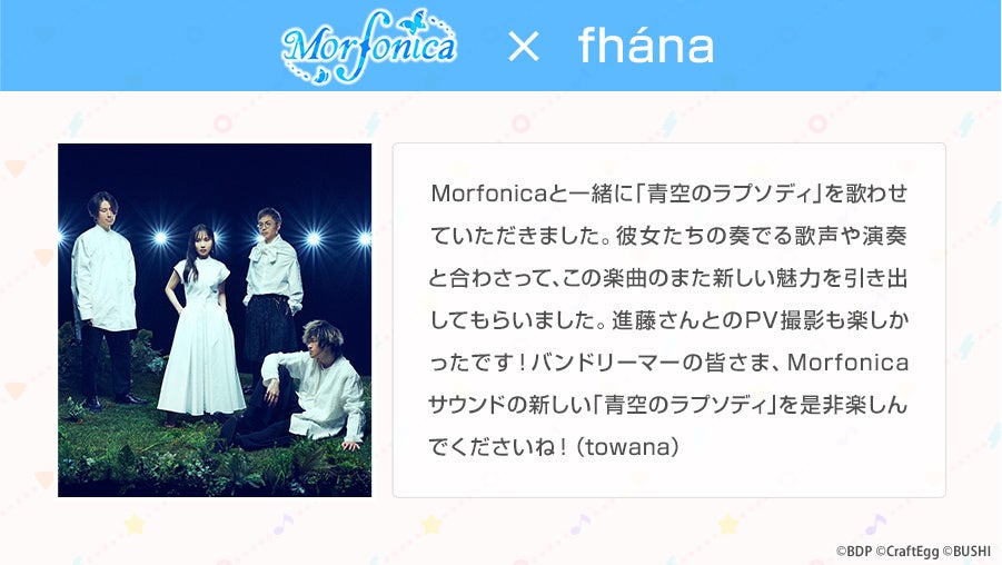 株式会社Craft Egg(本社:東京都渋谷区 代表取締役:森川 修一、以下、Craft Egg)と、株式会社ブシロード(本社:東京都中野区 代表取締役社長:橋本 義賢、以下、ブシロード)の共同制作によるスマホゲーム「バンドリ! ガールズバンドパーティ!」(以下、ガルパ)は、2022年4月28日(木)より、エクストラ楽曲第5弾として、Morfonica(Vo.倉田ましろ/CV.進藤あまね)とfhánaさんが歌うエクストラ楽曲『青空のラプソディ』をゲーム内に追加いたしました。