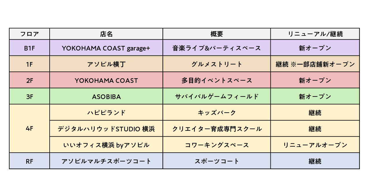 今回のリニューアルの目玉として、当社がこれまで東京 新木場にて2022年1月末まで運営しておりました「STUDIO COAST」をアソビルのB1F、2Fの2フロアを使って「YOKOHAMA COAST」として生まれかわらせます。これからは横浜を新たな拠点とし、様々なカルチャーの発信や音楽シーンを盛り上げてまいります。