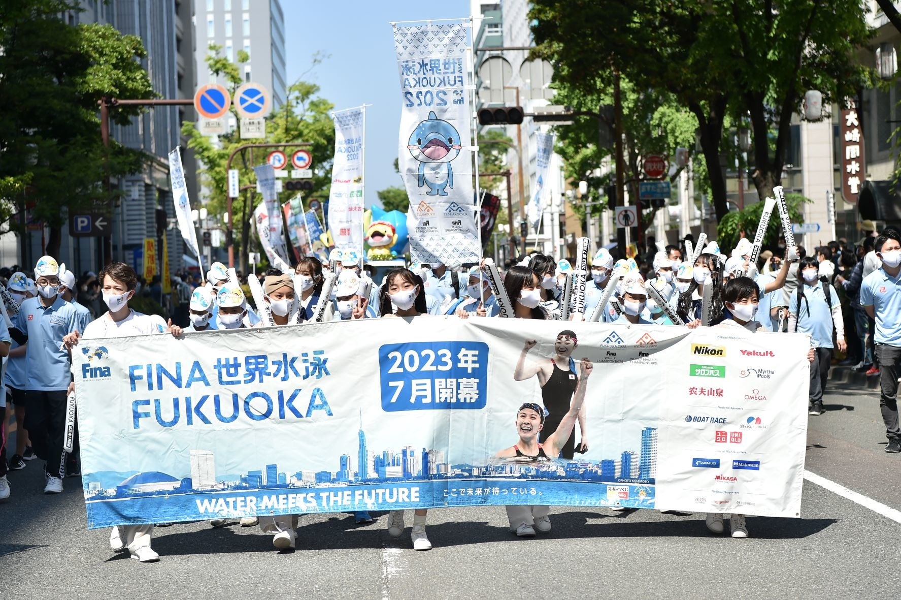 その後、「博多どんたく港まつり」のパレードに”FINA世界水泳FUKUOKAどんたく隊”の一員として参加。オンライン観覧している視聴者へ世界水泳のPRを行った。