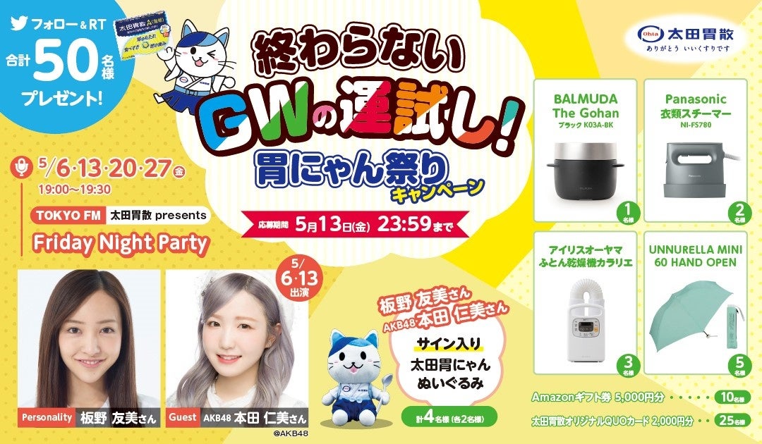 本キャンペーンは同社が提供しているTOKYO FM1ヶ月間限定プログラム『太田胃散 presents Friday Night Party』(5月パーソナリティ:板野友美さん 毎週金曜日19:00~OA)とのコラボ企画となっておりますので、ぜひ番組もお聴きください。