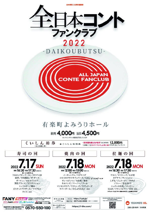 この度、数度にわたり開催されてきた、吉本興業主催コント好きなコント師によるコント好きのためのコントライブが2022年7月17日(日)・ 18日(月・祝)の2日間で計3公演を有楽町よみうりホール「全日本コントファンクラブ2022-DAIKOUBUTSU-」として開催が決定いたしました。