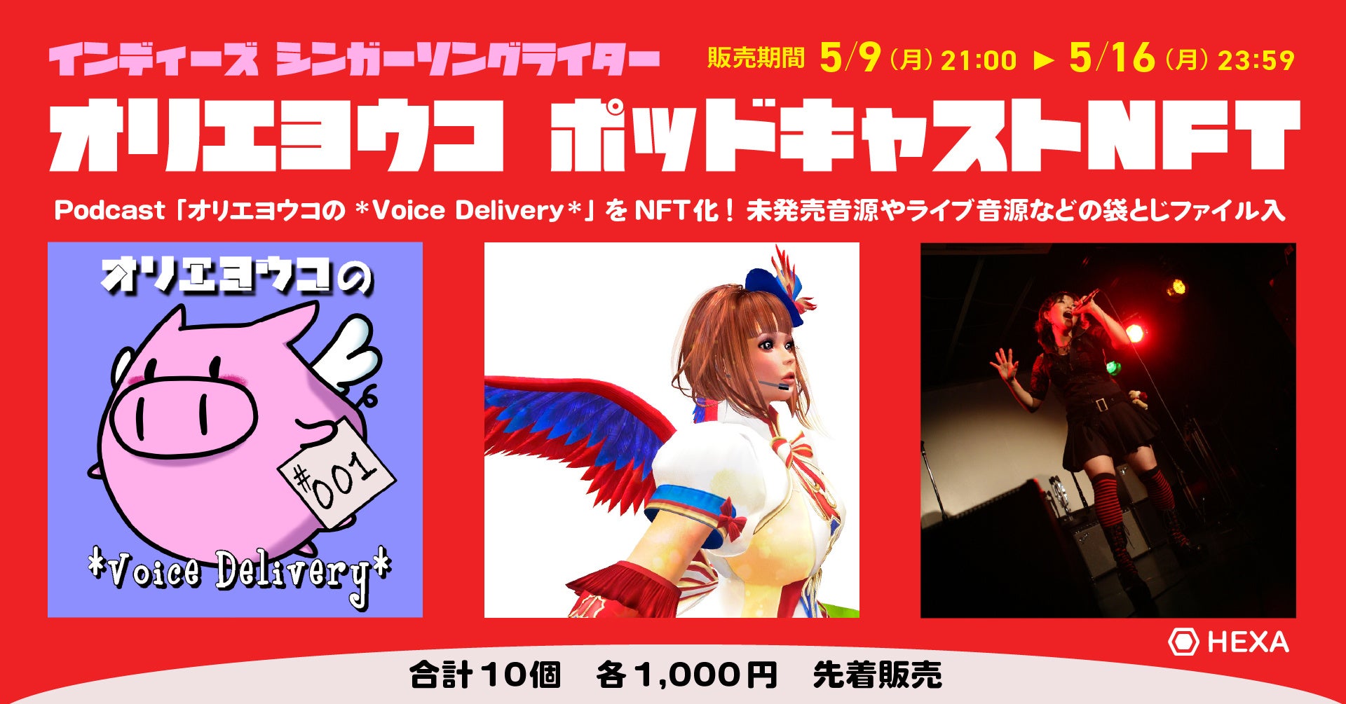 NFTマーケット「HEXA(ヘキサ)」では、シンガーソングライター「オリエヨウコ」さんのPodcast番組をNFT化して5/9(月)21時から先着順で販売します。