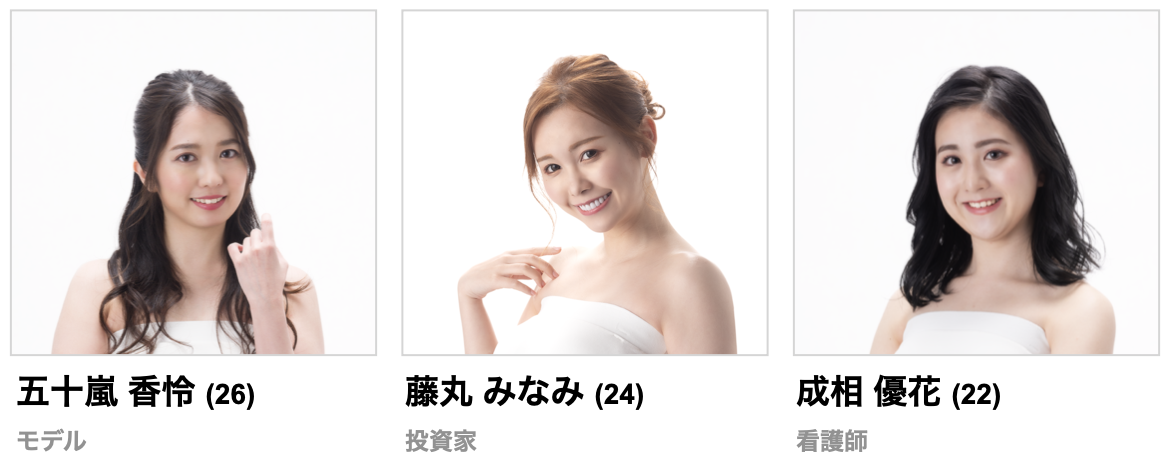 平川知子:ミスインターナショナル日本代表に選ばれ 、世界のミス同士が選ぶ「ミスフレンドシップ賞」を受賞。タレント・モデル活動を行う。その後、結婚を機に引退。 現在はModel&Beauty School『sen−se』のウォーキング・マナー講師を務める。