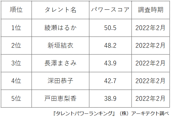『タレントパワーランキング』では、タレントパワーランキングに登録されている芸歴20年以上(2022年4月時点)の30代ベテラン女優のパワースコアを調査。