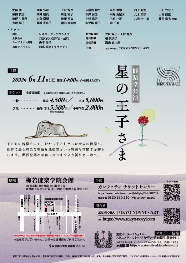 認定NPO法人 TOKYO NOVYI・ART 能楽堂公演「星の王子さま」が2022年6月11日(土)に梅若能楽学院会館(東京都中野区)にて上演されます。チケットはカンフェティ(運営:ロングランプランニング株式会社、東京都新宿区、代表取締役:榑松 ⼤剛)にて5月8日(日)より発売開始です。