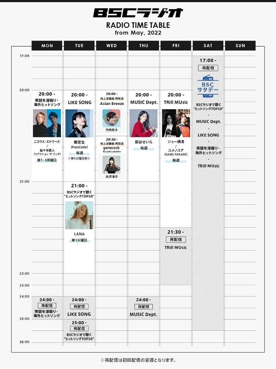 KKBOX Japan合同会社(所在地:東京都渋谷区、代表:谷 和博、以下KKBOX)が提供するインターネットラジオステーション「BSCラジオ(Backstage Caféより22年5月9日付けで呼称変更)」は、22年5月9日より番組改編を行い、新たに2番組をスタートいたします。