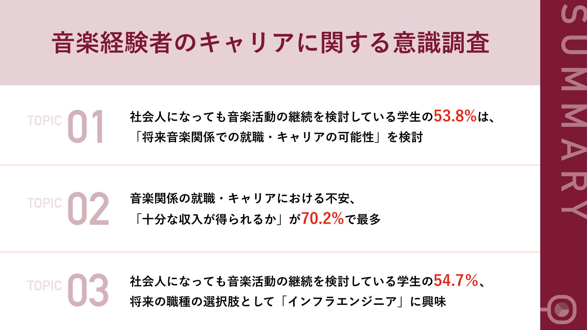 今回の調査では、社会人となり働きながらも音楽活動を続けたいと考えている学生において、将来の職種の選択肢として2人に1人が「インフラエンジニア」へ興味を示していることが明らかとなりました。音楽活動だけでは収入に不安が残る彼らの中には、音楽以外のキャリアを考える必要性を感じている人も多くいます。音楽以外のキャリアを考えた時に、PCやソフトウェアを駆使して業務にあたる「インフラエンジニア」という仕事は、機械いじりなどの観点から音楽活動と重なる部分があり、かつ安定した収入源となりうる魅力的な職種の一つのようです。