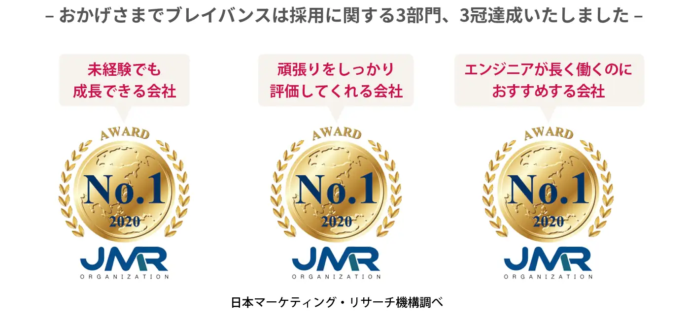 ブレイバンステクノロジーズは、「未経験でも成長できる会社 No.1」「頑張りをしっかり評価してくれる会社No.1」「エンジニアが長く働くのにおすすめする会社No.1」の採用に関する3部門で第一位に選ばれました。