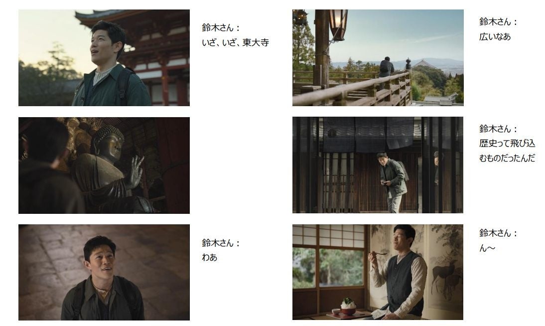 『いざ、いざ、東大寺!』という言葉と共に、鈴木亮平さんが東大寺の国宝・大仏殿を訪れるシーンからスタートします。見上げるほど大きな大仏様を参拝し、二月堂への裏参道で僧侶の方や鹿と触れ合った後、二月堂では開放感ある奈良の景色を堪能。その後はかき氷を頬張り、バーでカクテルを楽しむシーンへと続き、ならまちの魅力を伝えています。ラストは露天風呂に入りながら、奈良の街並みを眺め、鈴木亮平さんが奈良への思いを馳せます。