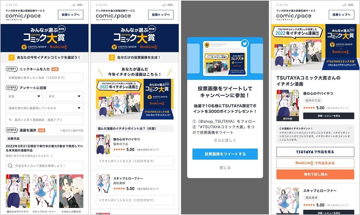 ・TSUTAYA限定Tポイントプレゼントキャンペーン…「comicspace」内特設ページで投票後、表示された画像を「#TSUTAYAコミック大賞」を付けてtwitterに投稿していただいた方の中から抽選で10名様にTSUTAYA限定Tポイント3,000ポイントをプレゼントいたします。ご当選された方には、投票期間終了後、当選した方のTwitterアカウントへDMを送らせていただきます。