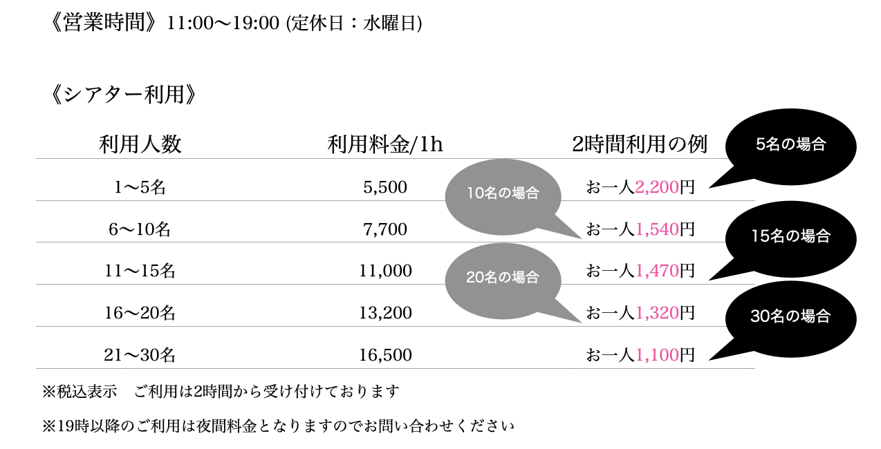最大30名収容の広々としたシアタースペースを1名からご利用いただけます