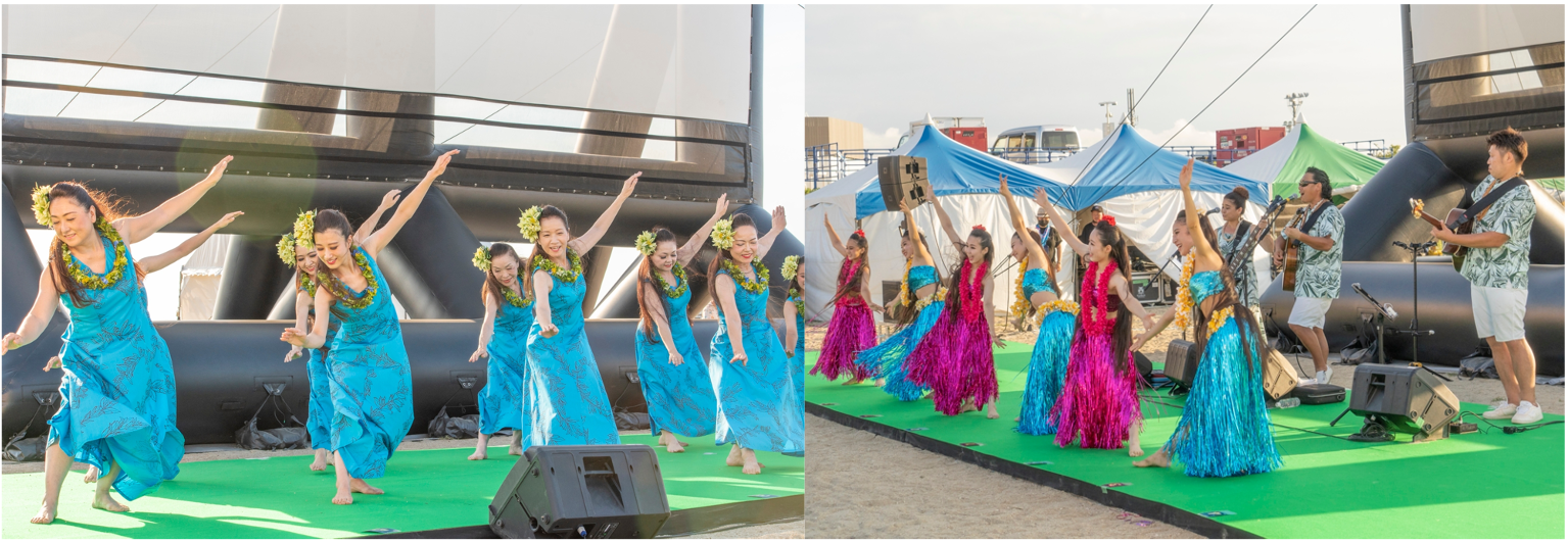 泉南の海を一望できるサザンストリートに設置される特設ステージでは、ハワイアンプロミュージシャンKaulanaさん(7月17日)、プロフラダンサーのYUHKIさん(7月18日)、によるプロデュースのもと、フラパフォーマンスやファイヤーナイフダンス、ハワイアンミュージックの生演奏等、プロ・アマ含む総勢30組を超えるパフォーマーによるライブショーでハワイの雰囲気をそのままにお届けいたします。