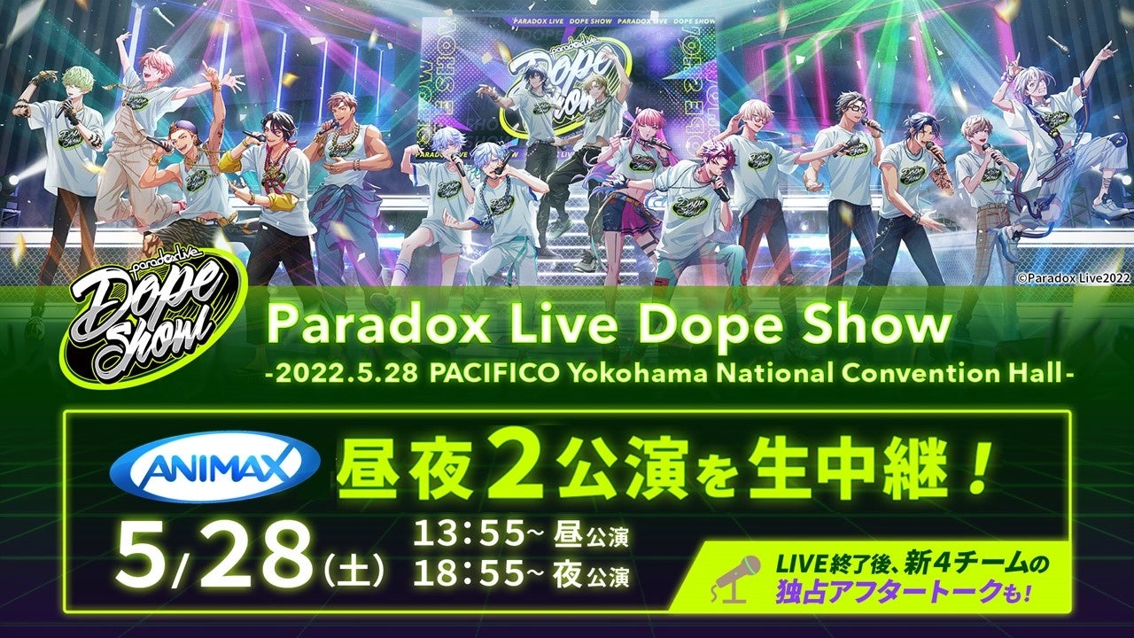 アニメ専門チャンネル<アニマックス>は、2022年5月28日(土) パシフィコ横浜で開催する「Paradox Live Dope Show」2ndリアルライブを昼夜2公演はもちろんのこと、Dope Show昼公演の生中継の直後に、新4チーム(VISTY/AMPRULE/1Nm8/獄Luck)のキャストによるアフタートークを<アニマックス独占生放送>します!