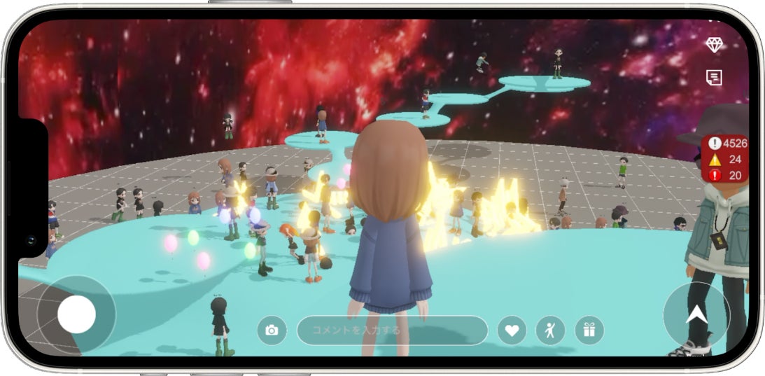 空間内は、アバターやエフェクトのグッズを販売するショップやアトラクションなどが設置される「PARKエリア」を中⼼に、臨場感の⾼いライブが体験できる「ライブステージ」、パフォーマーの企画やファン同⼠で交流できる「アーティストルーム」があります。