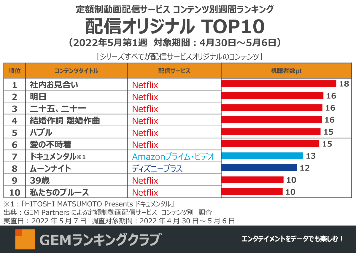 エンタテイメント業界に向けたデータ×デジタルマーケティングサービスを提供するGEM Partners株式会社(ジェムパートナーズ、所在地:東京都港区、代表取締役:梅津文)は5月13日(金)、エンタメコンテンツランキングやデータ情報を発信する「GEMランキングクラブ」プロジェクトにて作成した2022年5月第1週の「定額制動画配信サービス コンテンツ別週間ランキングTOP20(調査対象期間:4月30日~5月6日、調査対象:日本在住15~69歳男女)」を発表します。