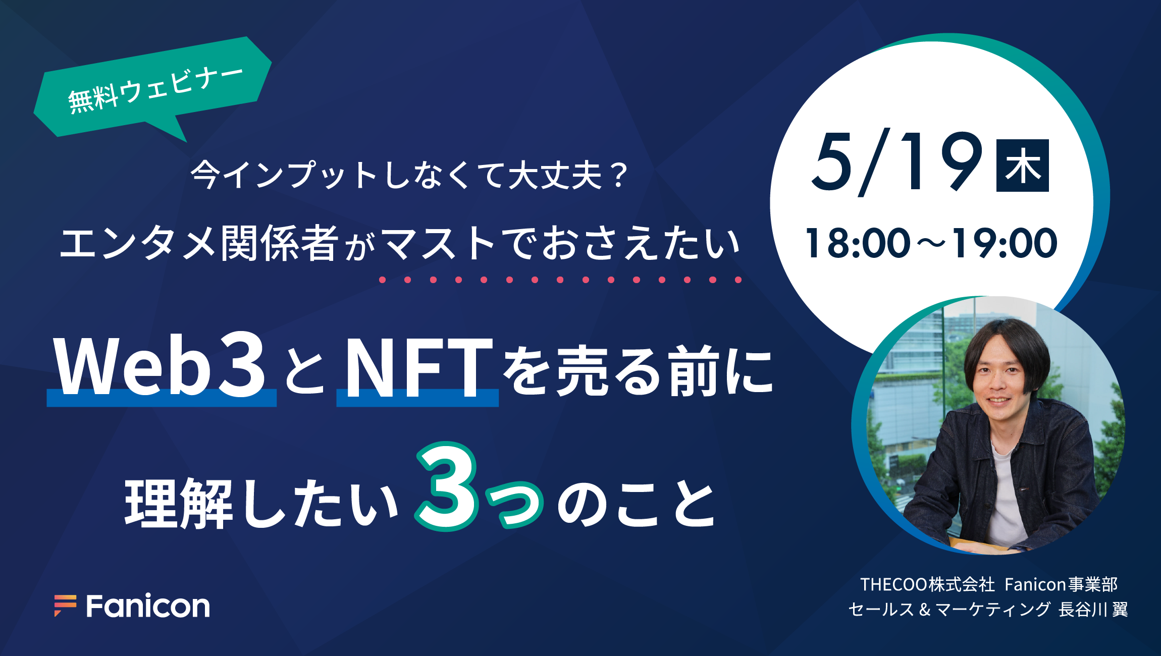 THECOO株式会社(本社:東京都渋谷区、代表取締役CEO:平良真人、証券コード:4255)は、2022年5月19日(木)18:00〜19:00にてエンタメ業界関係者に向けた無料ウェビナー「今インプットしなくて大丈夫?エンタメ関係者がマストでおさえたいWeb3とNFTを売る前に理解したい3つのこと」を開催いたします。