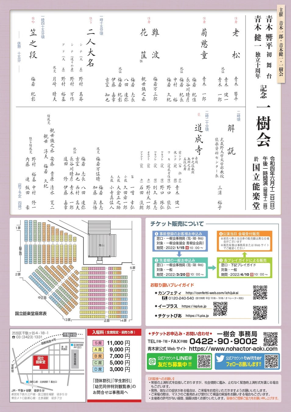 青木一郎/青木健一/一樹会主催、『青木響平初舞台 青木健一独立十周年記念 一樹会』が2022年6月12日(日)に国立能楽堂(東京都渋谷区)にて開催されます。チケットはカンフェティ(運営:ロングランプランニング株式会社、東京都新宿区、代表取締役:榑松 大剛)にて発売中です。