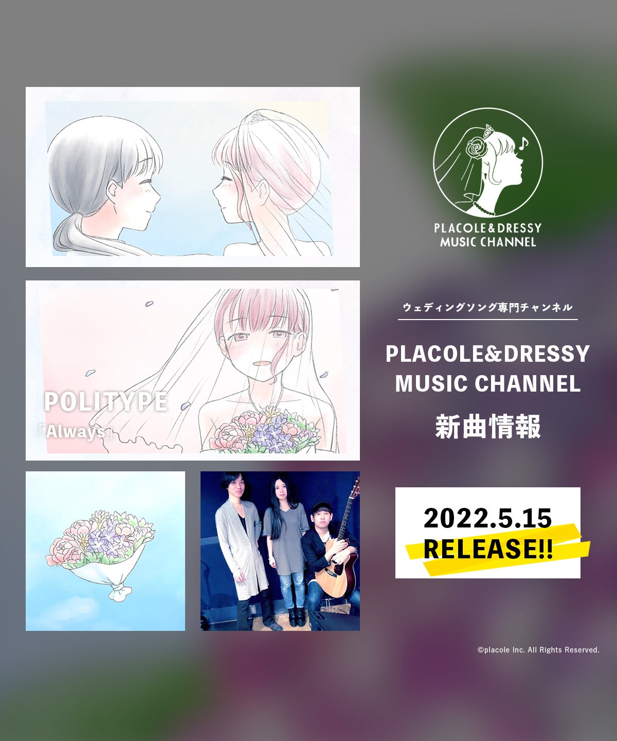 PLACOLE&DRESSY MUSIC CHANNEL」では、話題のアーティストとコラボを実施し、毎月新曲を配信いたします。5月は、3人組ロックユニットのPOLITYPE(ポリタイプ)とのタイアップが決定。これからの季節にぴったりのジューンブライドをイメージしたバラードの楽曲となっております。