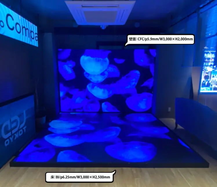 キラキラとした映像と強い明るさを誇るLEDビジョンのある空間で歌って踊っている姿、まるでステージ上にいるかのようにも感じます。ショールームにあるすべてのLEDビジョンに同じ映像を同時に映し出した空間は今までに見たことのない、迫力のある魅力的な空間を造り出しています。