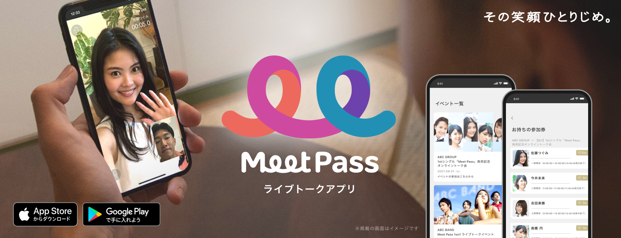 新型コロナウイルス感染症の拡大により握手会などのリアルイベントの開催が困難になるなか、電子チケットを推進してきた当社は握手券の電子チケット化の知見を活かし、オンラインにおいても握手会と同等もしくはそれ以上のユーザー体験をご提供するサービスとしてMeet Pass(ミートパス)を開発しご提供してきました。