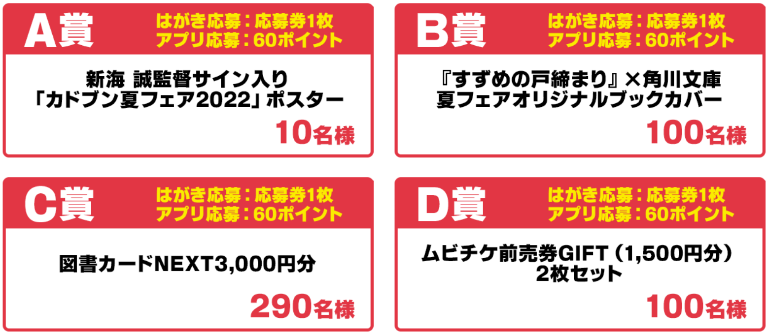 「カドブン夏フェア2022」対象書籍の帯に付いている応募券を集めて応募すると、抽選で豪華賞品を合計500名様にプレゼント! 新海監督サイン入りポスターや、夏フェア限定のオリジナルブックカバーなど、ここでしか手に入らないプレゼントも。ぜひ奮ってご応募ください!