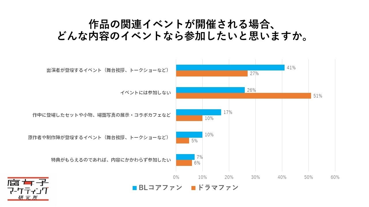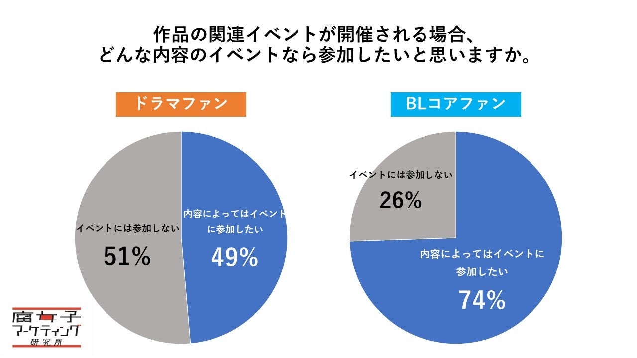 全回答のうち「イベントには参加しない」と答えた人の割合を比べてみると、ドラマファンが51.4%であるのに対して、BLコアファンはわずか26%となりました。