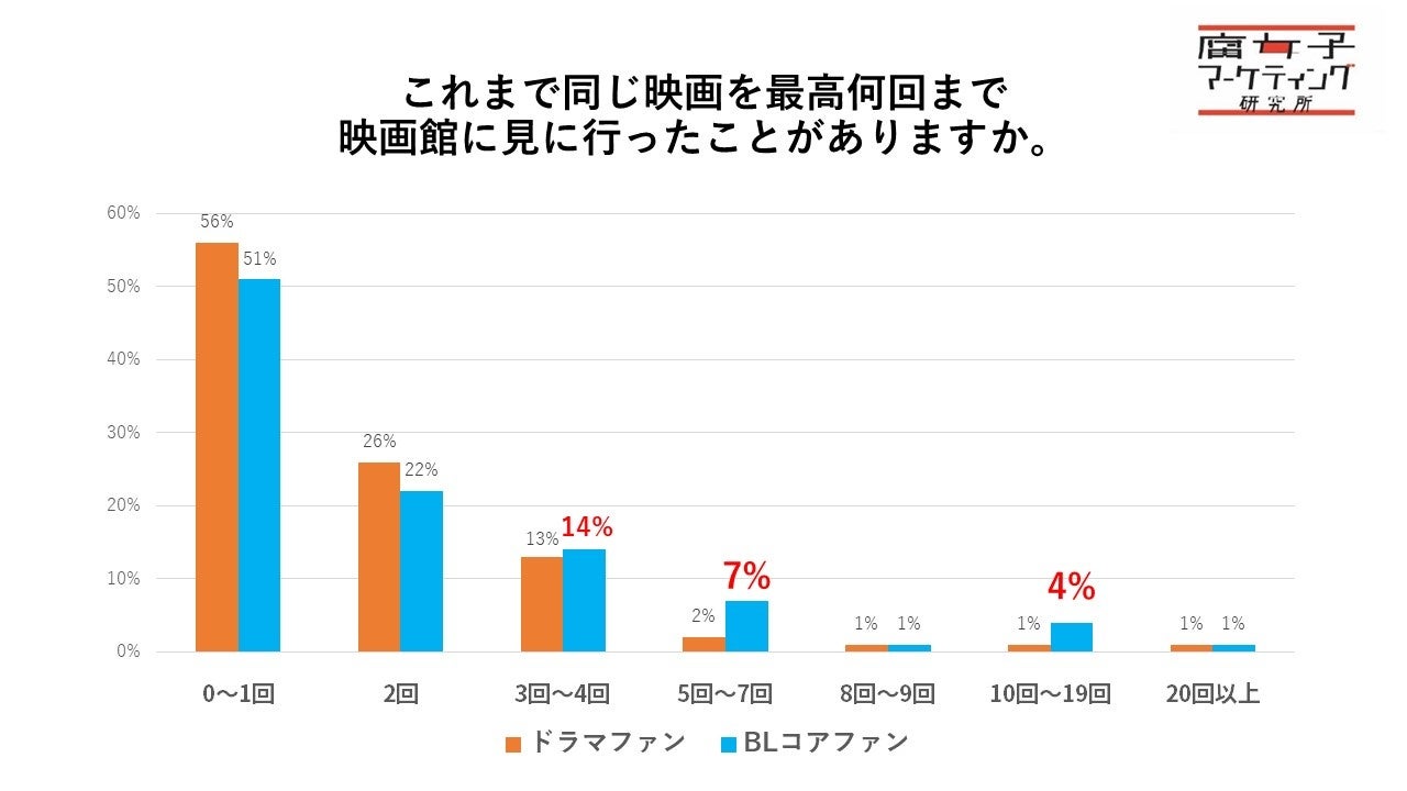 「10回~19回」と回答した人も、ドラマファンの1.1%に対して、BLコアファンでは4%存在していました。