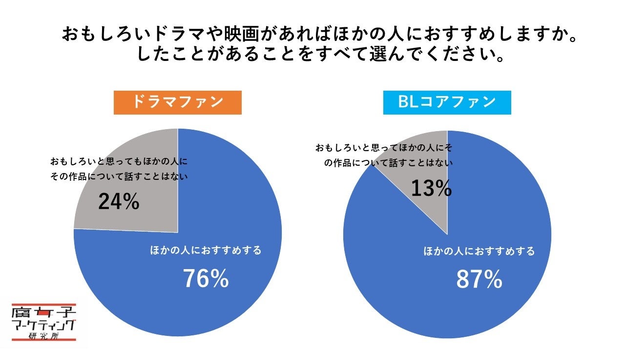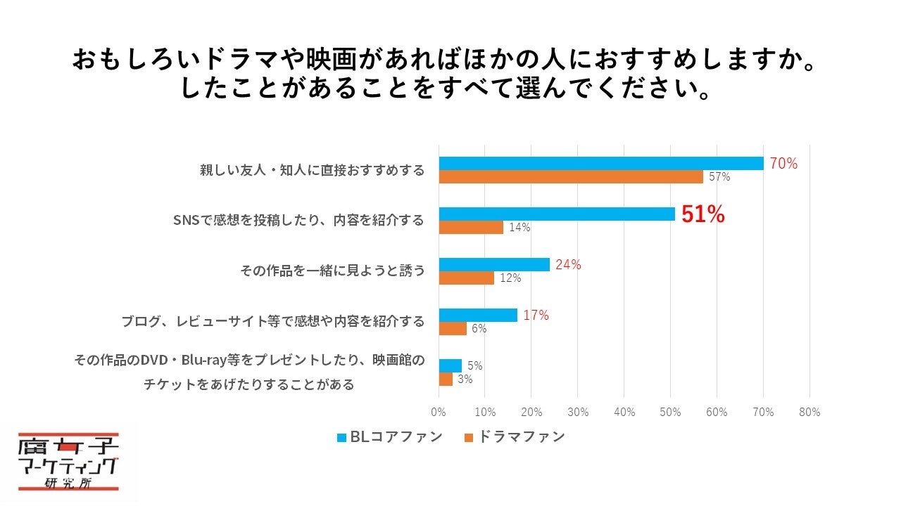 「SNSで感想を投稿したり、内容を紹介」したことがある人は、ドラマファンでは全体の13.6%であるのに対して、BLコアファンでは51%にのぼりました。
