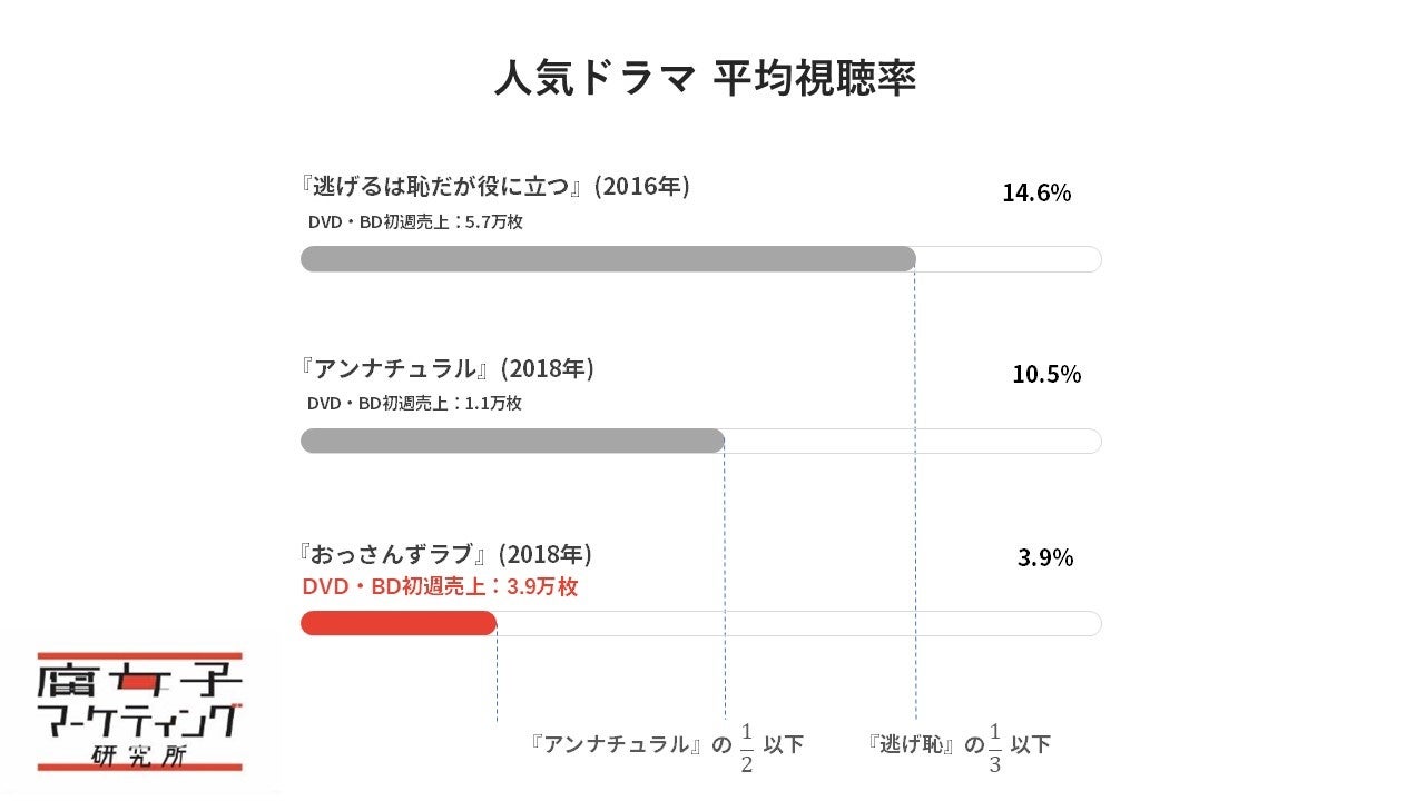 しかし、DVD・Blurayの初週売り上げをみると、ドラマ「逃げるは恥だが役に立つ」の5.7万枚、ドラマ「アンナチュラル」の1.1万枚に対して、ドラマ「おっさんずラブ」は3.9万枚を記録しました。