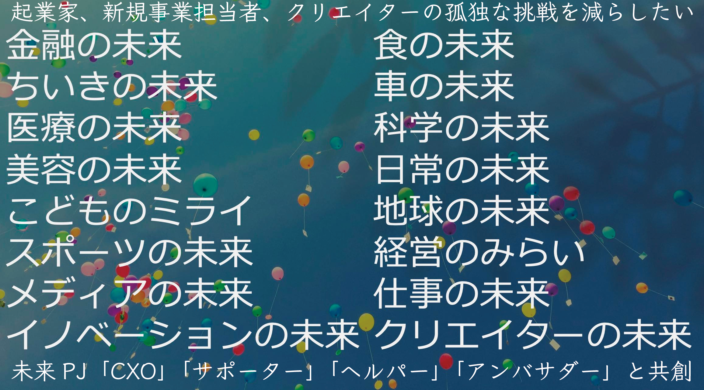 【起業家、新規事業担当者、クリエイターの孤独な挑戦を減らしたい】未来プロジェクトの「CXO」「サポーター」「ヘルパー」「アンバサダー」との共創の場を実現へ。アドバイスではなく、共に応援し合う、学び合う