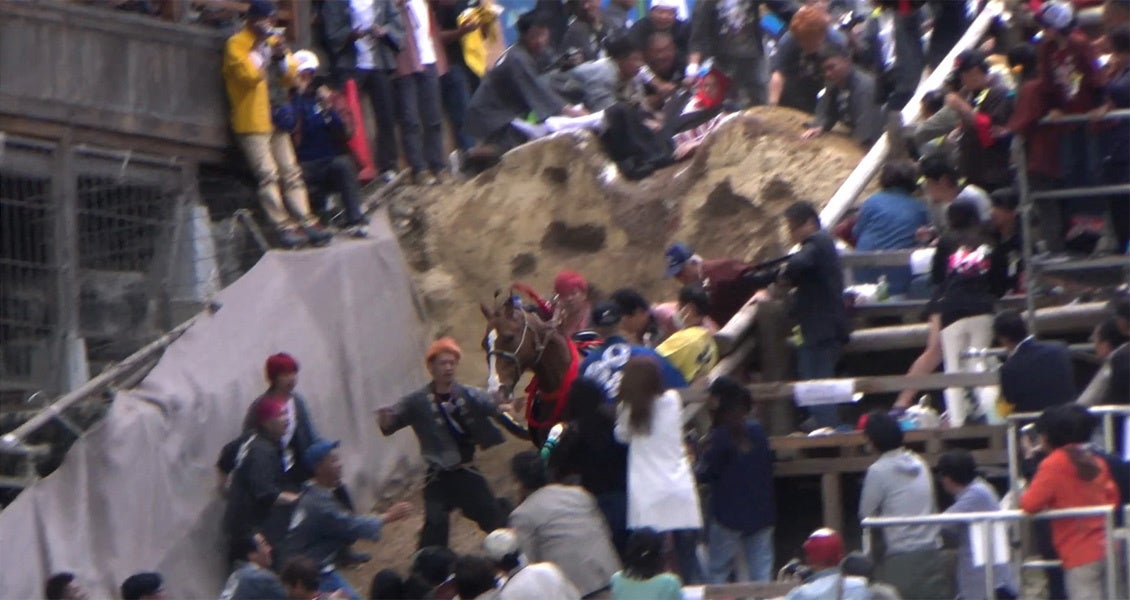 この「多度祭」の最大の見せ場である「上げ馬神事」は、多度町内の6地区がそれぞれ馬と騎手を選出し、馬に乗った騎手が巨大な壁を超えられるか挑戦するまさに命がけの奇祭。