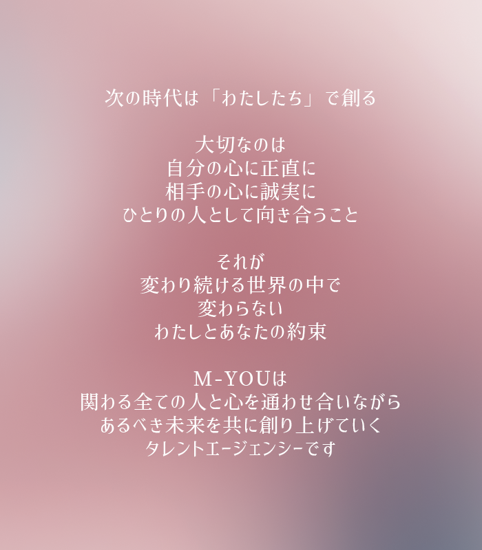 M-YOU(エムユー)は、「私(me)とあなた(you)」から由来しており、私たちM-YOUに関わる全ての人と心を通わせながら未来を創り上げていく、次世代タレントエージェンシーです。