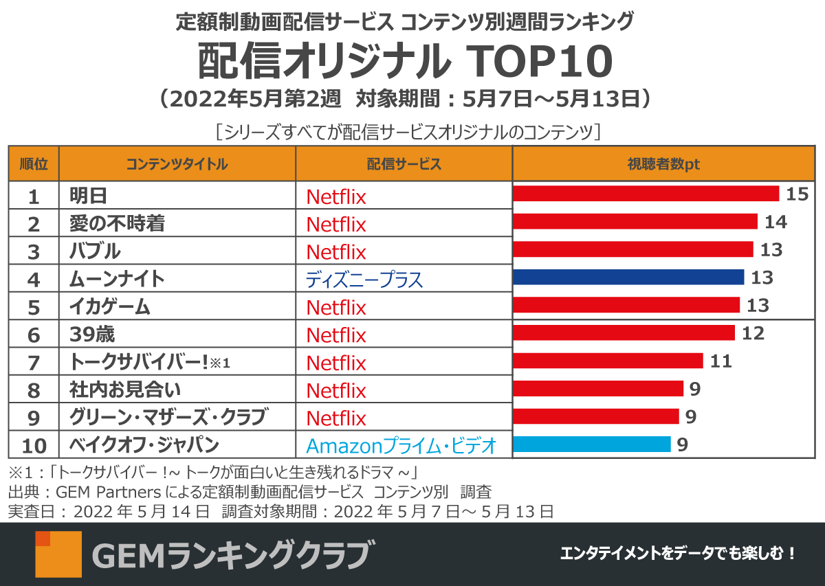 エンタテイメント業界に向けたデータ×デジタルマーケティングサービスを提供するGEM Partners株式会社(ジェムパートナーズ、所在地:東京都港区、代表取締役:梅津文)は5月18日(水)、エンタメコンテンツランキングやデータ情報を発信する「GEMランキングクラブ」プロジェクトにて作成した2022年5月第2週の「定額制動画配信サービス コンテンツ別週間ランキングTOP20(調査対象期間:5月7日~5月13日、調査対象:日本在住15~69歳男女)」を発表します。