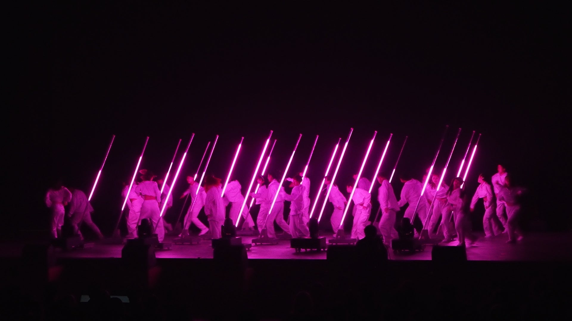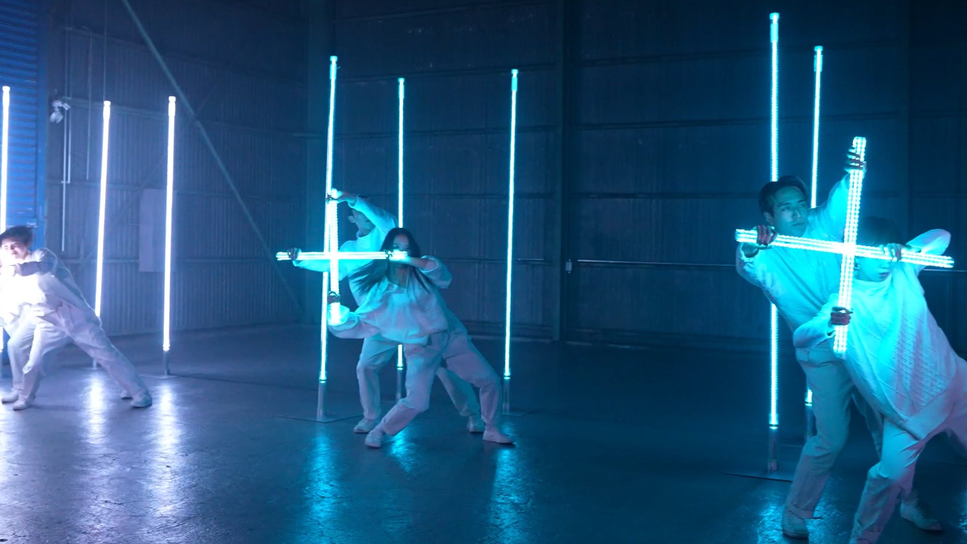 MPLUSPLUSオリジナルの小型無線LEDデバイスを用いたLED POLEプロダクト。80cmのソードタイプから250cmの舞台演出タイプまで数種類。ポールが自立できる可動式台車で直立・斜め立ての演出も可能です。また、設置していたポールを途中で手持ちに変更も可能です。250cmのLEDポールを立方体や正三角形に組み立てる土台も開発し、様々な演出に対応しています。