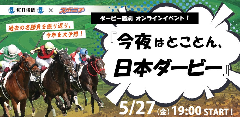 毎日新聞社(代表取締役社長執行役員:松木健)は、5月29日(日)の第89回日本ダービー(東京優駿、GⅠ)を前に、毎日新聞×スポニチ「ダービー直前オンラインイベント!『今夜はとことん、日本ダービー』」を27日(金)午後7時から開催します。1996年に一般紙で初めて競馬欄を設けた毎日新聞の”予想陣”+スポニチが誇る穴党記者「万哲」+TX「土曜競馬中継」でリポーターを務めた目黒貴子さんで、日本最強の3歳馬を決めるダービーを直前大予想。さらに、数あるレースの中でもダービーが「特別」な理由や忘れられない過去の名勝負にも迫ります。競馬ファンのみならず、どなたでも楽しめる内容です。ぜひご参加ください!