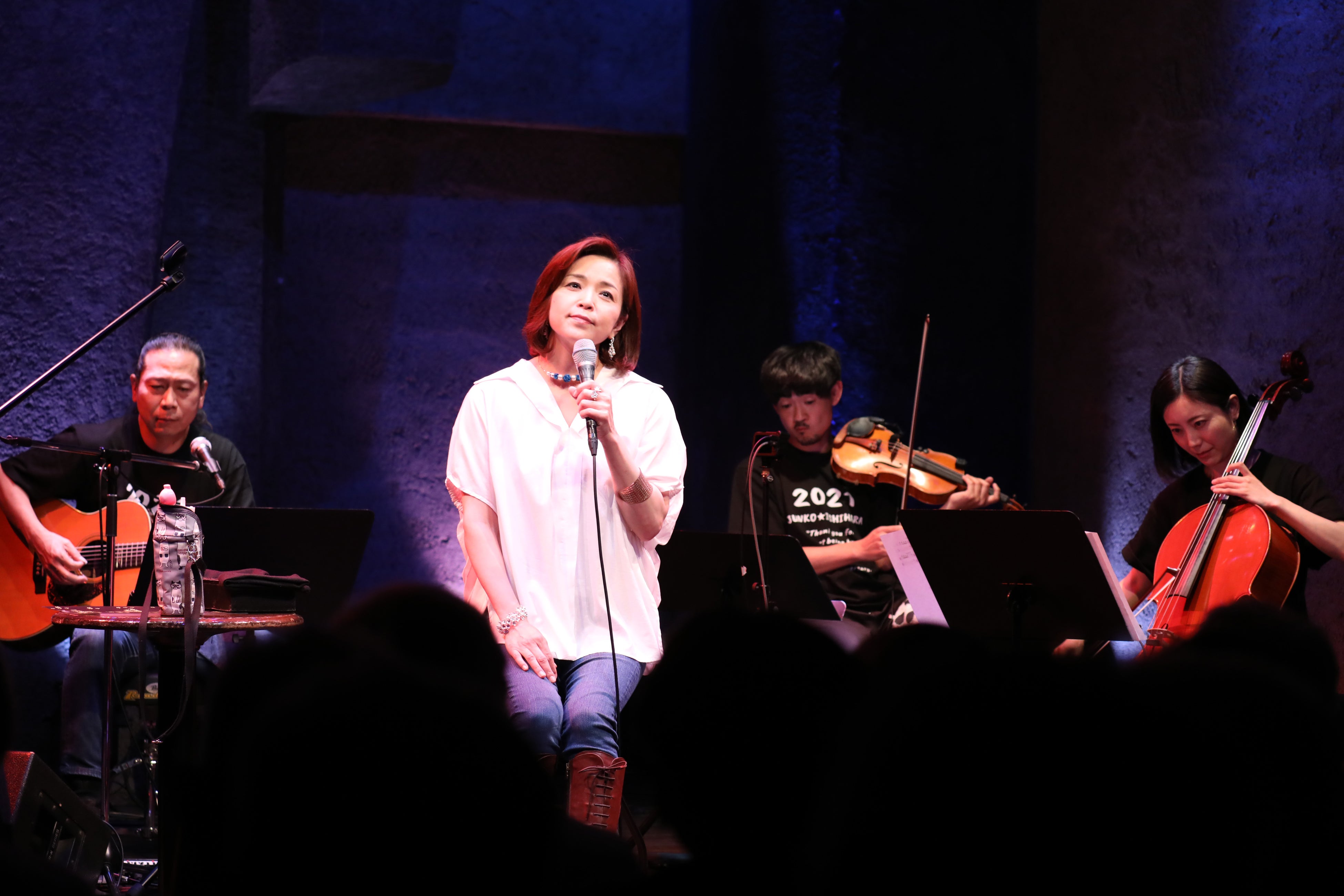 続いて披露したのは中島みゆき‘75年のデビューシングル「アザミ嬢のララバイ」。研ナオコをはじめ多くの歌手がカバーしてきた名曲、先の「初恋」からは一転、哀しみやわびしさが漂う歌詞を気だるく呟くように歌い、冒頭から対照的な2曲を披露した石原。表現者としてこの日のライブへの意気込みを感じさせる選曲に、会場の期待が高まっていく。