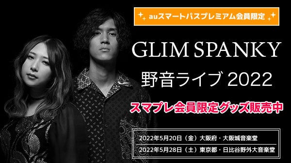 「auスマートパスプレミアム」は、エンタメ体験やショッピング割引など、 「おトク」な生活を提供する全てのスマホに対応した月額サービス。この度、 GLIM SPANKYのライブ「GLIM SPANKY 野音ライブ 2022」のオフィシャルグッズとして、「auスマートパスプレミアム会員限定グッズ」を5月23日(月)から完全受注販売することが決定しました。また、KDDI株式会社とぴあ株式会社が運営するエンターテイメントサイト「uP!!!」にて、2022年5月28日(土)開催の「GLIM SPANKY 野音ライブ 2022」の東京公演を、同日18時から独占生配、さらに「auスマートパスプレミアム」では、本公演の配信視聴チケットを特別価格にて販売中です。