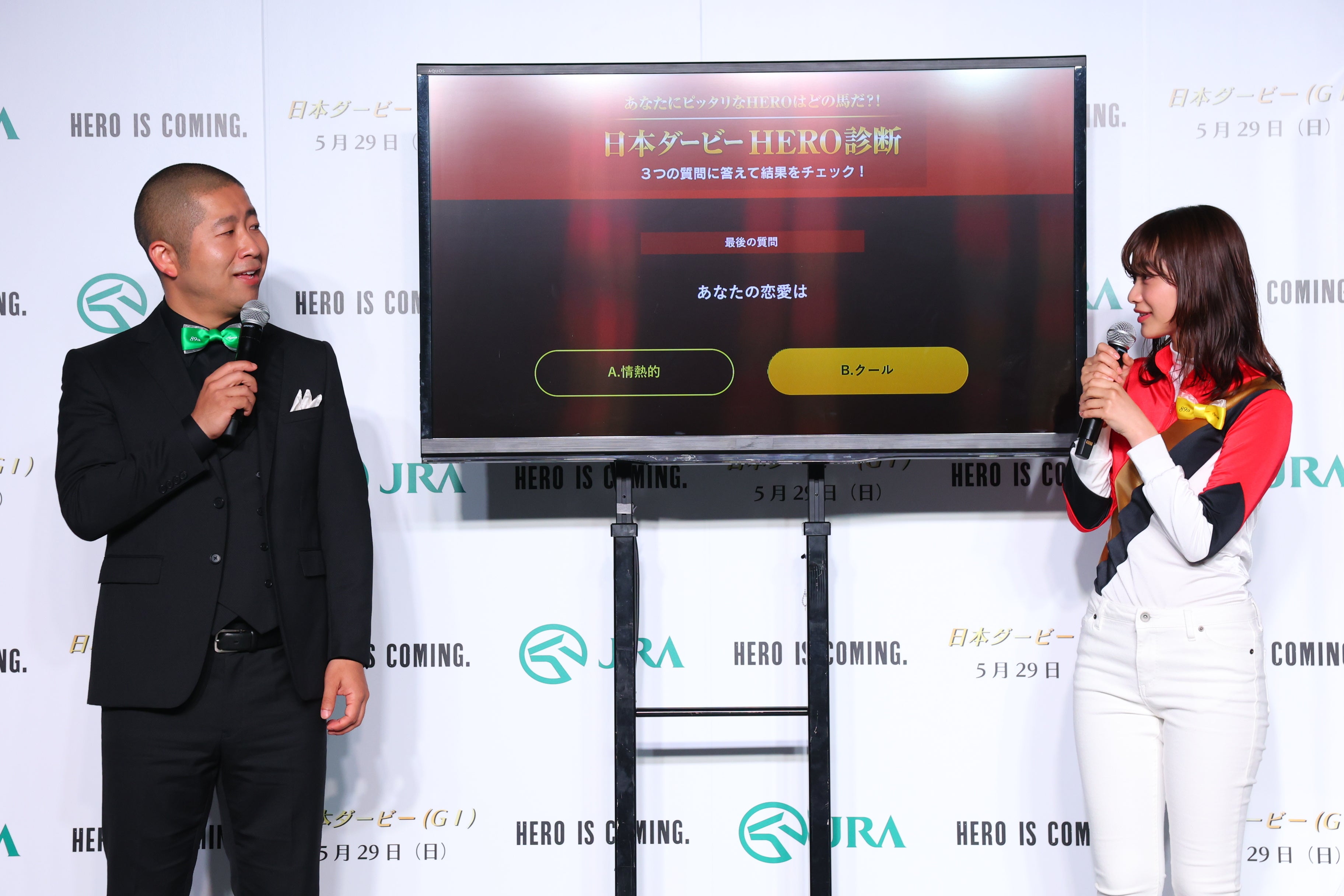 上映が終わり、プログラムは『日本ダービー HERO診断』についての紹介へ。簡単な3つの質問に答えるだけで、回答者にぴったりのダービー馬を診断することができるというMCの説明に対して「最高じゃないですか!」と興味津々の澤部さん。さらに2018年から3年間日本ダービーの実況を担当し、長年競馬シーンの第一線で活躍するアナウンサーの福原 直英さんがダービー馬の解説役として合流、福原さんの「是非これから3人で日本ダービーの歴史を作っていきましょう!」との日本ダービーへの熱の籠ったコメントとともに、『日本ダービー HERO診断』がスタートしました。