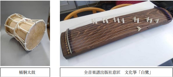 展示品:流木から試作した桶太鼓 及び 文化箏(全音楽譜出版社意匠 文化箏「白鷺」) ※展示品は益田市内企業が購入し、その売上金の一部を益田市内の環境保護団体に事業支援金として寄付展示品:流木から試作した桶太鼓 及び 文化箏(全音楽譜出版社意匠 文化箏「白鷺」) ※展示品は益田市内企業が購入し、その売上金の一部を益田市内の環境保護団体に事業支援金として寄付